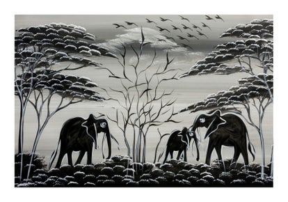 BillionHers African Wall Art – Hand-Painted Abstract Elephants, Acrylic Canvas 70x50cm, Black/Grey