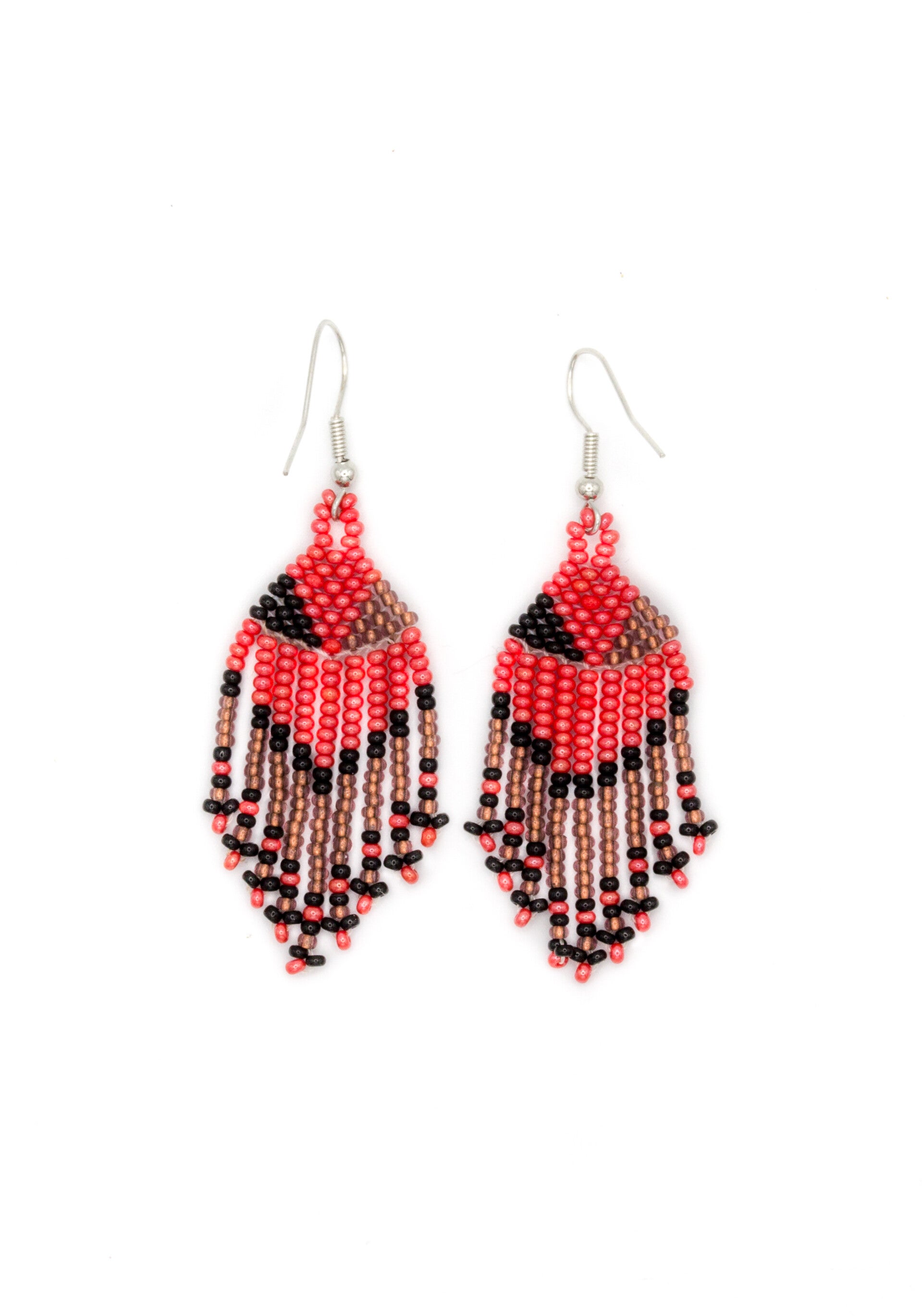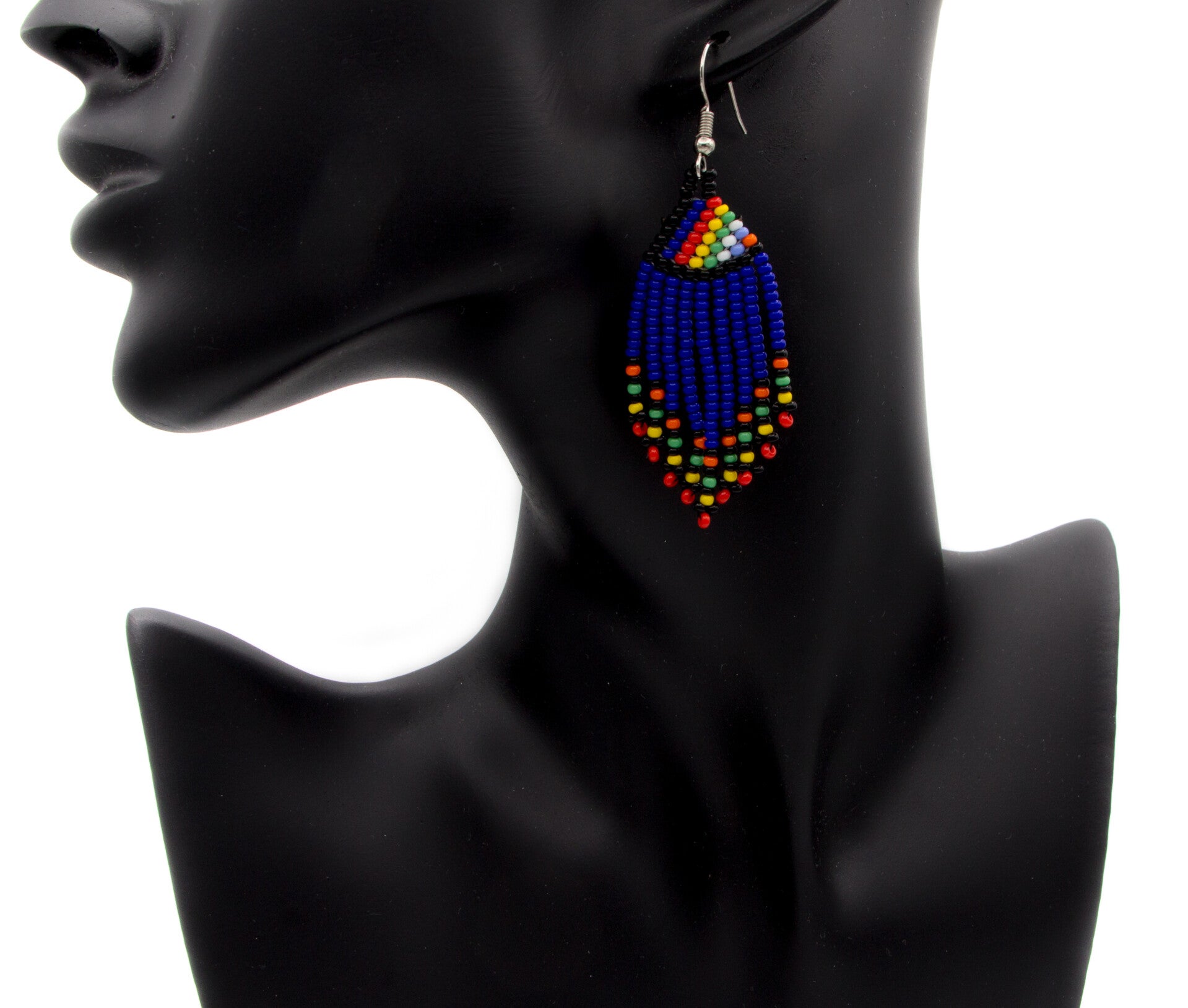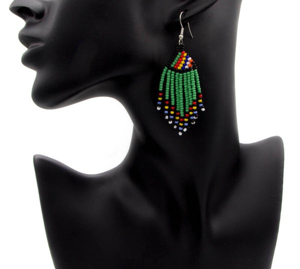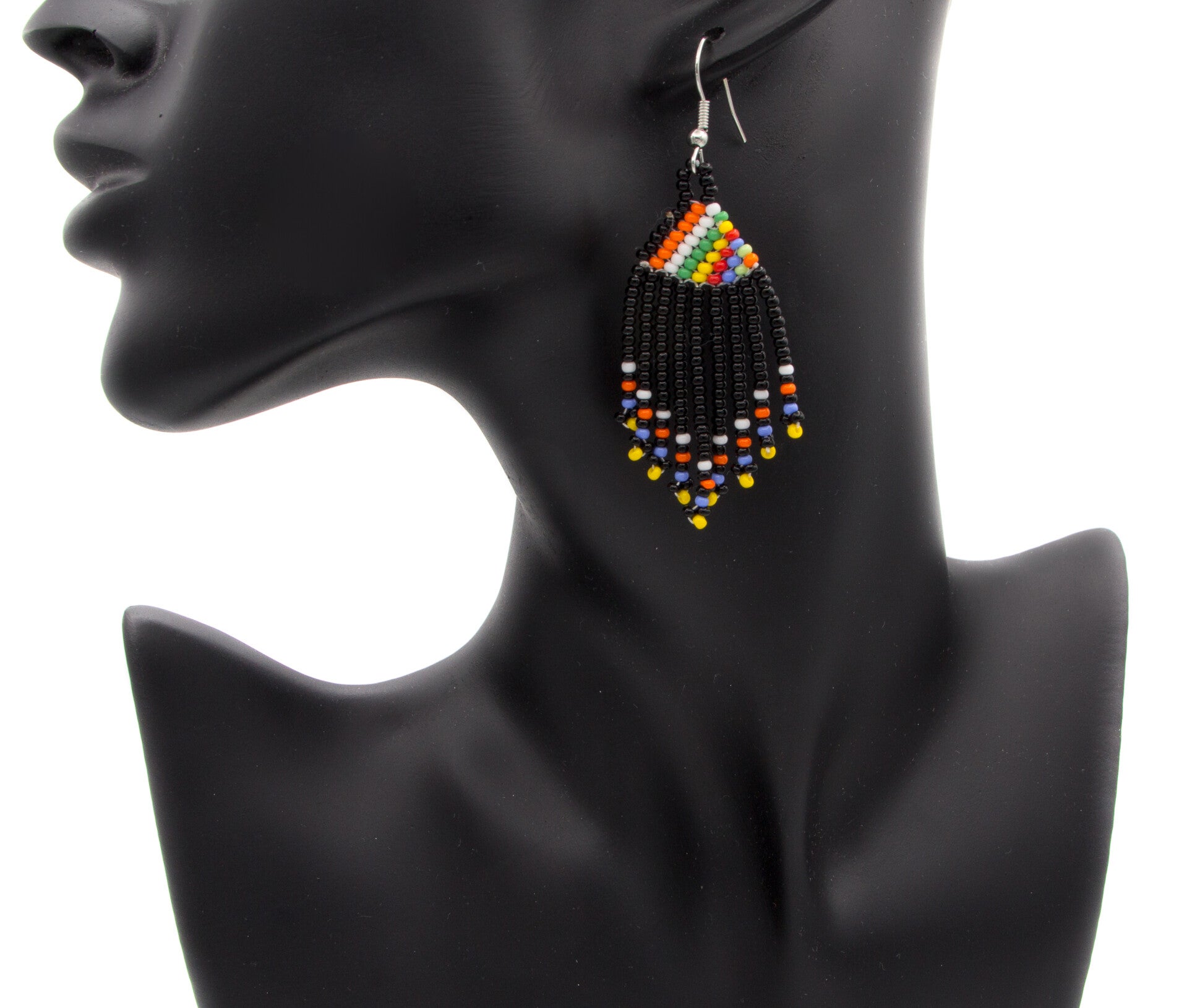 Colourful tassel earrings with a bold ethnic tribal triangle pattern for vibrant, cultural style.