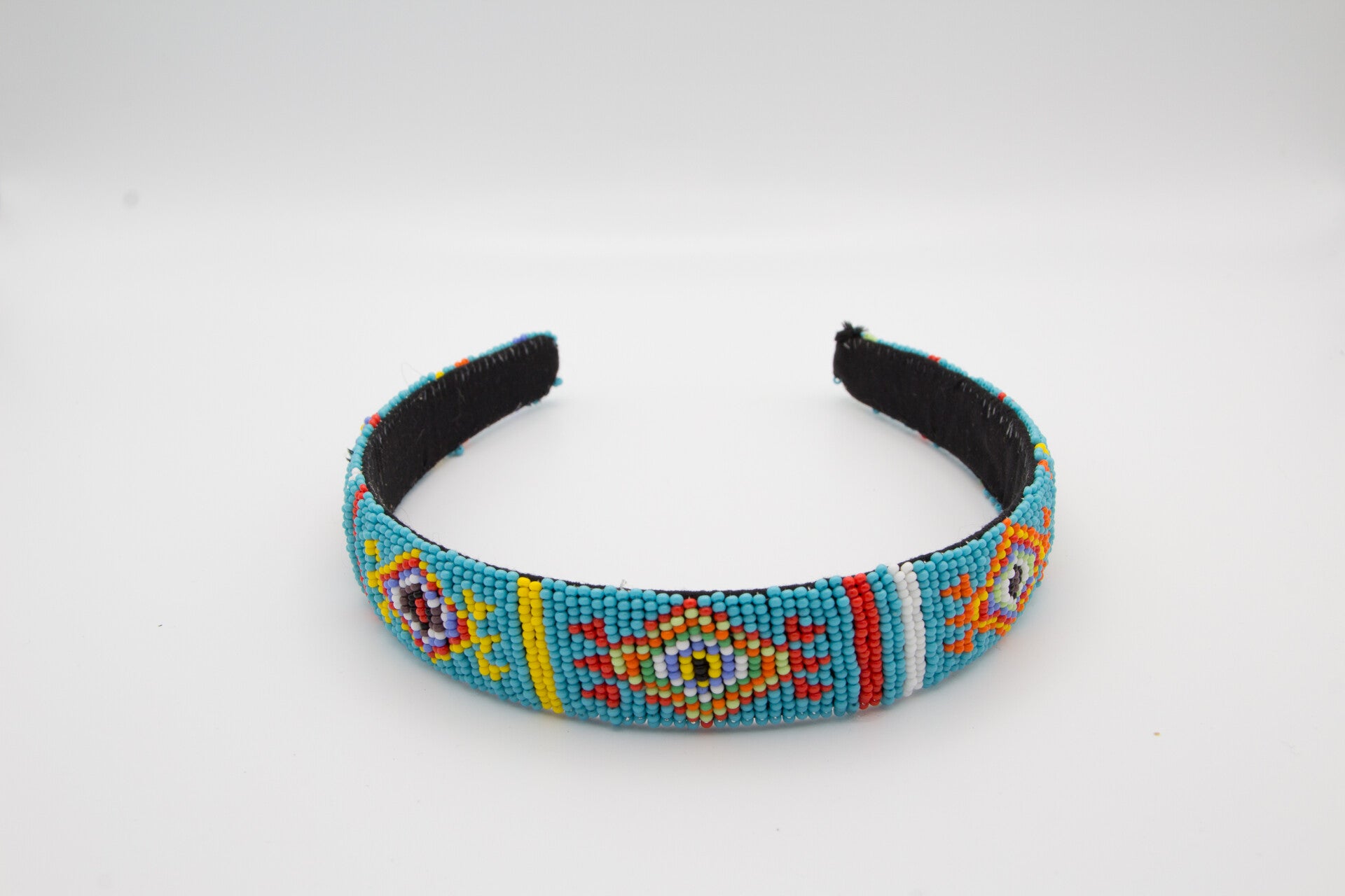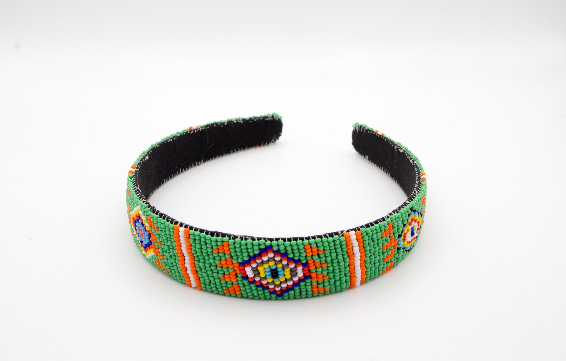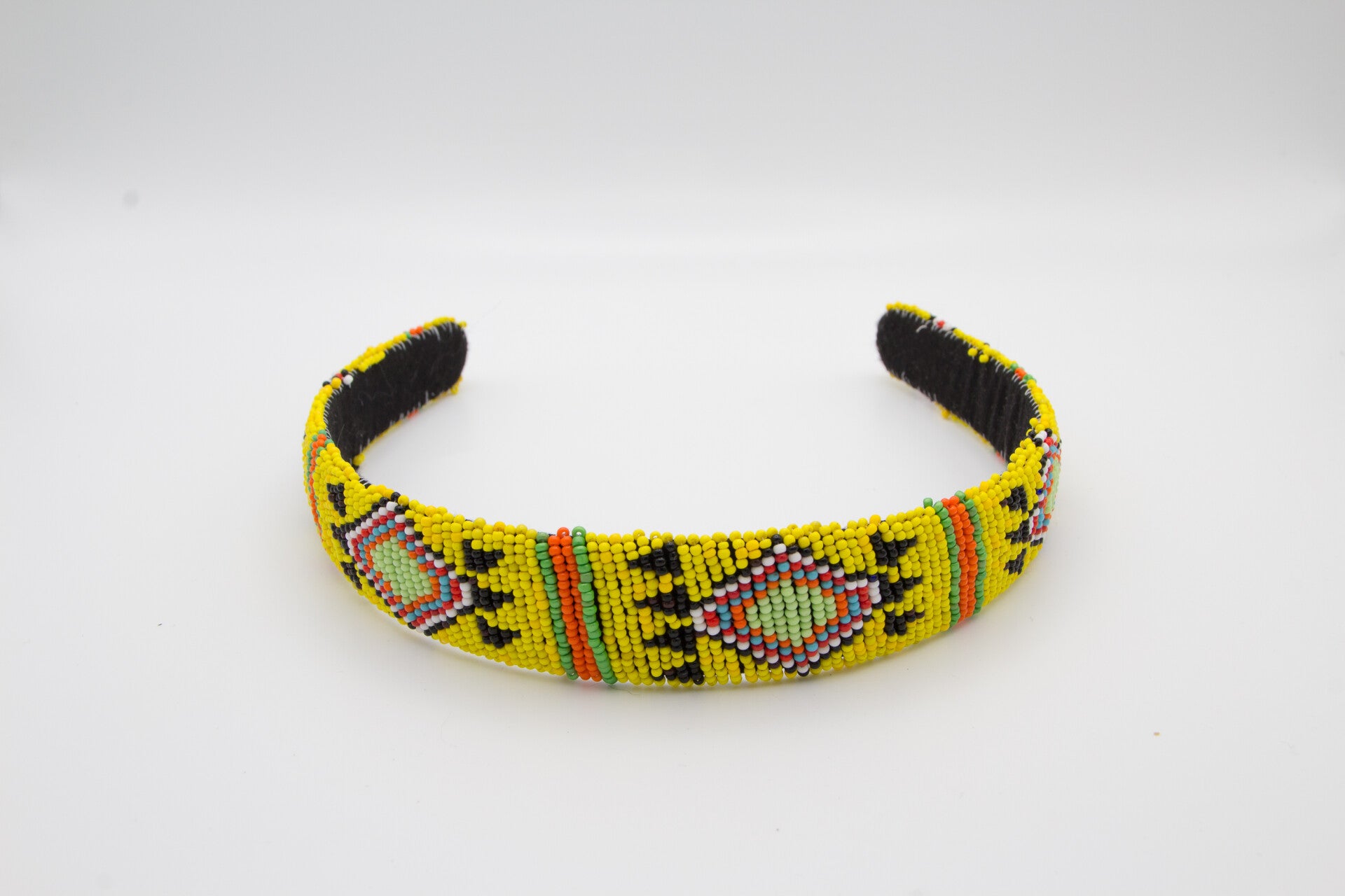 Bold beaded headband with vibrant geometric patterns for a stylish African flair.